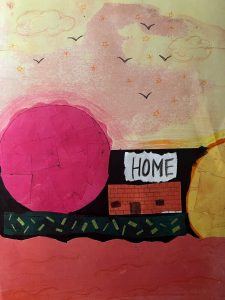 I chose this piece of art, called “Full pink sun half a yellow sun,” to add to because from the moment I looked at it, I could already see the many similarities between the shapes and colors used in the artwork and videos of the Kakuma refugee camp that I watched.