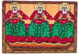 I purchased these paintings from Semachw Messfn in Ethiopia in 2004. Sumachaw was ten years old. He is a Coptic Christian. This is an ancient branch of Christianity. These paintings are made within an ancient tradition of Coptic religious art. There are religions that embrace religious paintings. Christianity, Buddhism, and Hinduism are examples.
