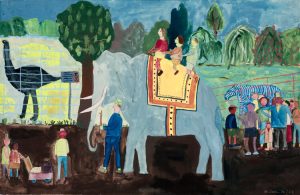 These paintings from children in Switzerland were created in the 1960s. We particularly love the old fashioned zoo scenes where children ride elephants. Two street scenes from the city of Basel show a clear winter day and grey winter day. Both are wonderfully evocative of a city in winter in Northern climates. Note the fabulous old black convertible in the grey scene.