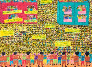 We at the Children's Art Foundation were very lucky to be given these extraordinary felt pen drawings by the Egyptian government in the late 1970s. Besides being unusually strong works of children's art most of them depict a day in history that still resonates: the visit by Egyptian President Anwar Sadat to Israel in 1977 to negotiate a peace treaty.