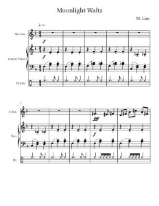 "Moonlight Waltz" is a new piece written for piano, saxophone, and drums. I was inspired to compose this when I started learning about jazz style. I wanted to incorporate some of the things I learned to compose a waltz. It is called "Moonlight Waltz" because I imagine dances under moonlight to be very beautiful.