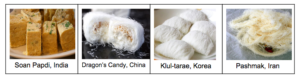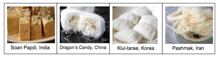 Types of cotton candy include Soan Papdi in India, Dragon’s beard candy in China, Klul-tarae in Korea, Pashmak in Iran, and this last has countless more items.