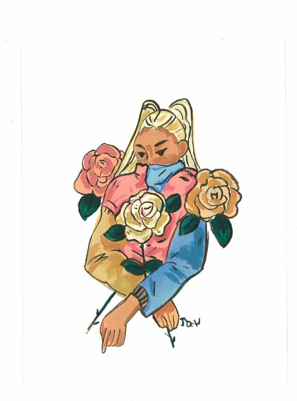This girl is covering her face as covid has urged us all to do. The roses represent the beauty we can find even when things aren’t going quite how we want.