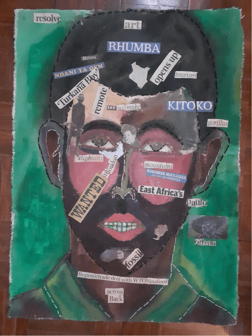 Mixed media on canvas, paint, newspapers, embroidery