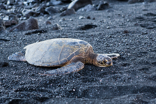 Grown turtle on the shore of Black Sand Beach in Hawaii