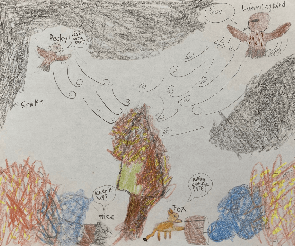 Once upon a time, in a far away land, there was an ordinary bird, Pecky. Pecky was a plain looking, shy, and reserved hummingbird. She was not particularly strong, nor considered herself brave. She was always leaning on her parents. Her family lived in The Silent Woods, named by the mayor, Mr. Fluffy Tail. Despite the name, the forest was anything but quiet. The chitter-chatter of all the creatures, from rodents to leopards, echoed through the babbling streams to the forest sky. On one memorable day, the birds went wild screeching for help while the foxes, bears, and raccoons chatted up a storm about what would become of them. The energy in the forest felt like a birthday party with thousands of animals all talking at once. The billowing smoke started to seep through the tree branches. Red sparks lit up the dry bushes and leaves then quickly burned along the tree bark. The inferno had begun to creep close to their adobe.