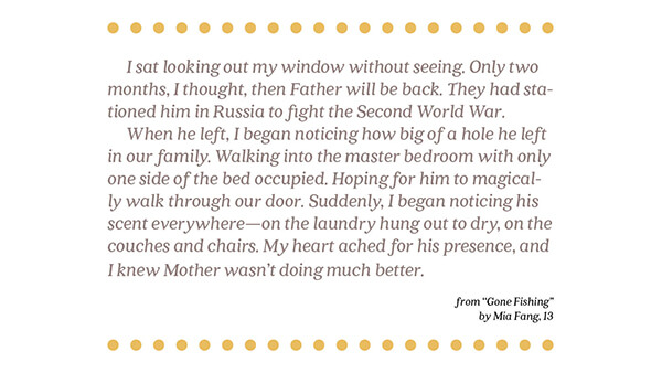 We loaded our little rowboat on a lake with our bait, fishing poles and lunches. Here on the lake, there was a peaceful silence, away from the crowds and people. Away from the vendors and markets. I felt safe here. It was Father’s and my special place here, where we had come so often. I climbed into the gently rocking boat and straightened my posture.