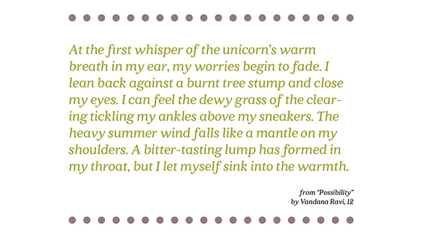 At the first whisper of the unicorn’s warm breath in my ear, my worries begin to fade. I lean back against a burnt tree stump and close my eyes. I can feel the dewy grass of the clearing tickling my ankles above my sneakers. The heavy summer wind falls like a mantle on my shoulders. A bitter-tasting lump has formed in my throat, but I let myself sink into the warmth.
