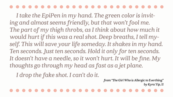 I take the EpiPen in my hand. The green color is inviting and almost seems friendly, but that won’t fool me. The part of my thigh throbs, as I think about how much it would hurt if this was a real shot. Deep breaths, I tell myself. This will save your life someday. It shakes in my hand. Ten seconds. Just ten seconds. Hold it only for ten seconds. It doesn’t have a needle, so it won’t hurt. It will be fine. My thoughts go through my head as fast as a jet plane.
