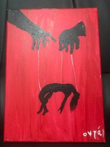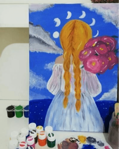 Artist description of the piece (translated from Arabic): The colors are nice. Behind the picture, there is a ghost. It is the ghost of a killer.