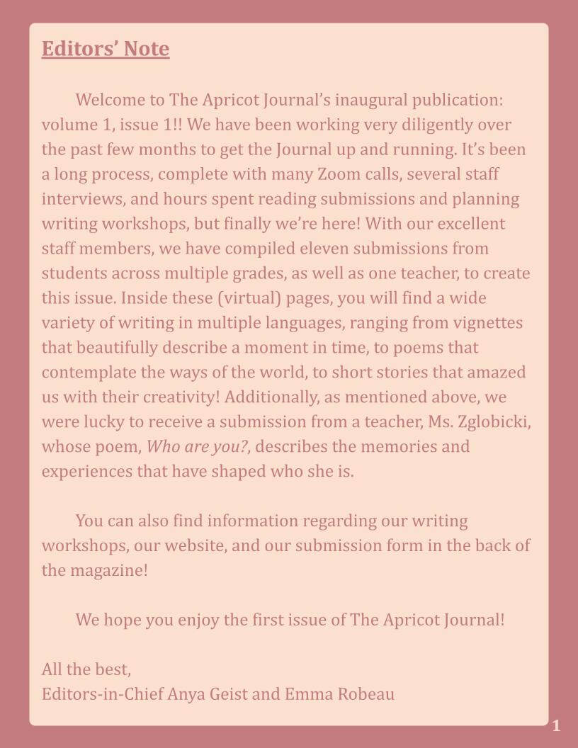 Mrs. Eressy also suggested that I ask a peer to help run the magazine. Following her advice, I reached out to Emma Robeau, a tenth grader who I’d gone to school with since elementary school. Emma was excited to work on the project, and so she and I became the founders and Editors-in-Chief of what would soon be called The Apricot Journal.