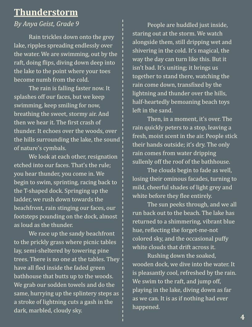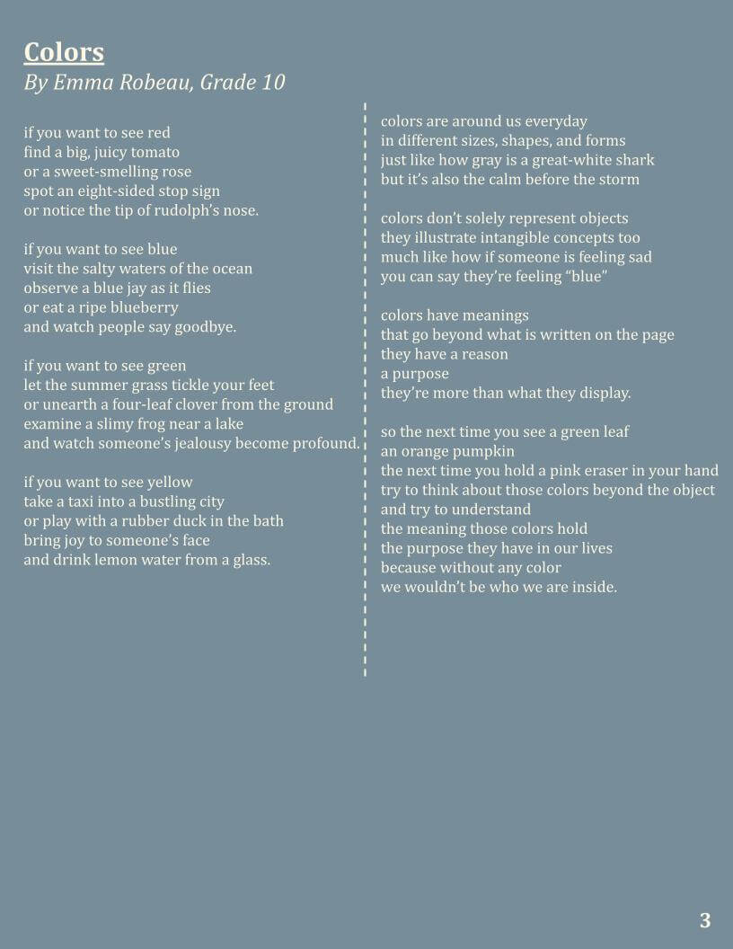 It contained all of the things that a normal literary magazine might contain: an Editors’ Note, a table of contents, a bunch of writing (eleven pieces in ours, I think), and a page where we listed our staff members. We were also lucky to have one teacher submit a poem, and so we had a Teacher Spotlight, which followed the students’ work.