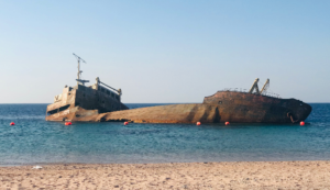 The water surrounding this ship is turquoise, which hosts vibrant marine life, colourful corals and ornate white sandy beaches.