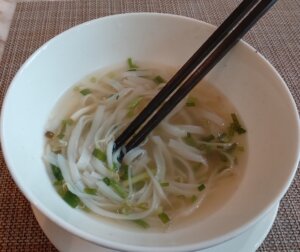 Pho is the lifeline of Vietnamese people, and it was my family’s lifeline while we were there. It is made of chicken or beef broth, flattish, thick rice noodles, pieces of meat, sprouts and spring onions. If you want you could also add spicy sauces and other things. It was through Pho that I finally learned how to use chopsticks, though in a rather roundabout manner.